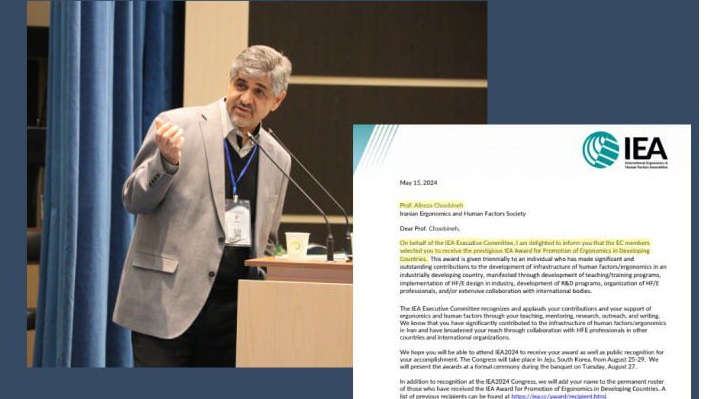 ۱۴۰۳/۴/۳ - دکتر علیرضا چوبینه موفق به دریافت جایزه " ارتقا ارگونومی در کشورهای در حال توسعه " از انجمن بین المللی ارگونومی گردید.