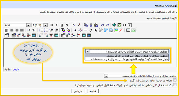 همچنین میتوانید از امکانات ارسال پست الکترونیک و ارسال پیغام به کاربران مدیریت برقراری ارتباط) نیز برای خبررسانی به نگارندگان بهره ببرید.
