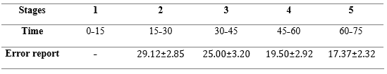 Table 1- Students' accuracy and performance in 5 steps: (1: 0 to 15 minutes, 2: 15 to 30 minutes, 3: 30 to 45 minutes, 4: 45 to 60 minutes, 5: 60 to 75 minutes)